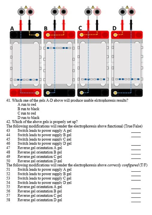 Scientific Method and Post-lab answers are available. Many labs include example results (lab 7, gel level shown above). There are many answers that are NOT given, as these depend on the results generated during the experiment.