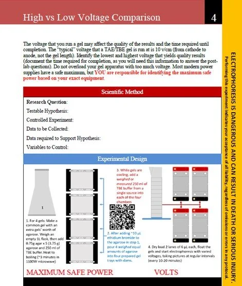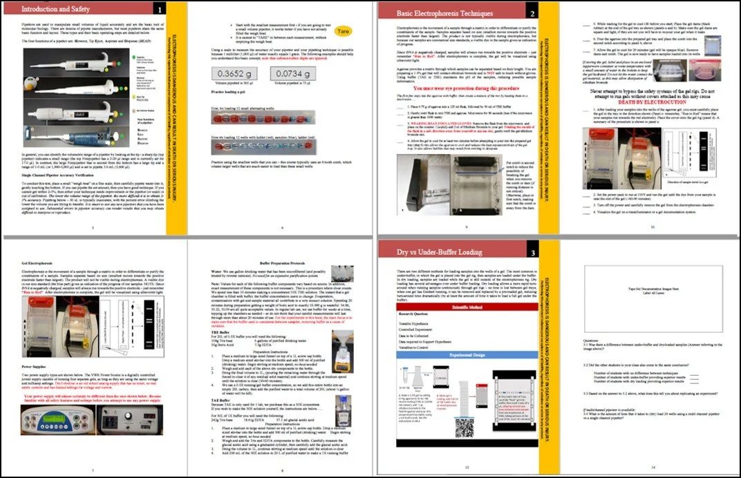 Nine Core Labs/Topics include Introduction and Safety, Basic Electrophoresis Techniques, Dry vs Under Buffer Loading, High and Low Voltage Comparison, Volume of Buffer Comparison, Sample Volume vs Well Size, Effect of Gel Level, Effect of Debris or Pipetting Error, Effect of Angled/Slanted Comb.
