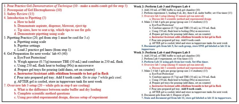 The first three meeting schedules. Week 1 (left) includes an introduction to safety, pipetting and initial gel preparation, while weeks 2 and 3 (right) show the suggested order of each lab meeting. Red text indicates instructor-led activity, black text indicates student activity and blue text indicates multi-week lab activity. Parentheses indicate approximate time for each step. This information is provided to instructors in Microsoft Word format to allow modification.